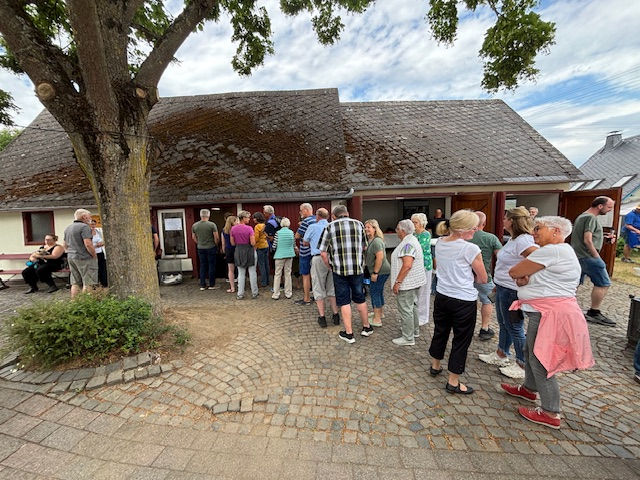 Am Sonntagmorgen wurde das Backes dann erneut angeheizt – diesmal für den großen Auftritt der berühmten Flammkuchen. Die von unseren Backesfrauen mit viel Liebe und Erfahrung vorbereiteten Leckereien waren heiß begehrt: Schon nach 1 1/2 Stunden war alles ausverkauft! Die Schlange vorm Backes wuchs im Minutentakt – ein klarer Beweis für die Qualität.